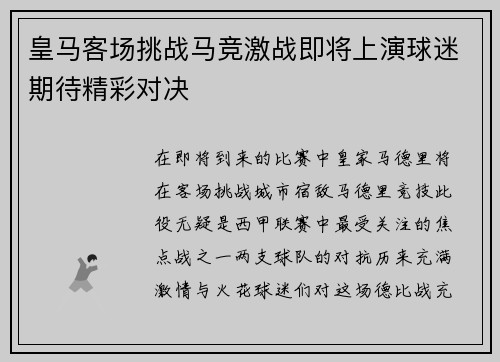 皇马客场挑战马竞激战即将上演球迷期待精彩对决