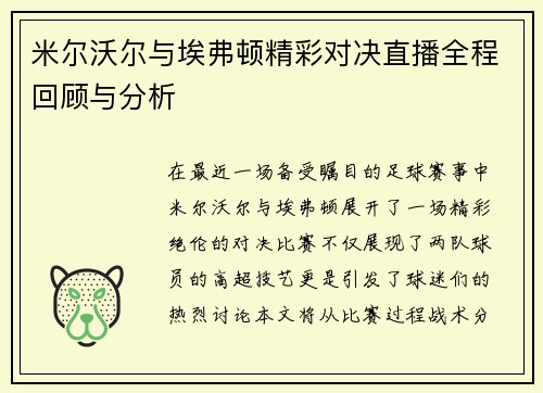 米尔沃尔与埃弗顿精彩对决直播全程回顾与分析